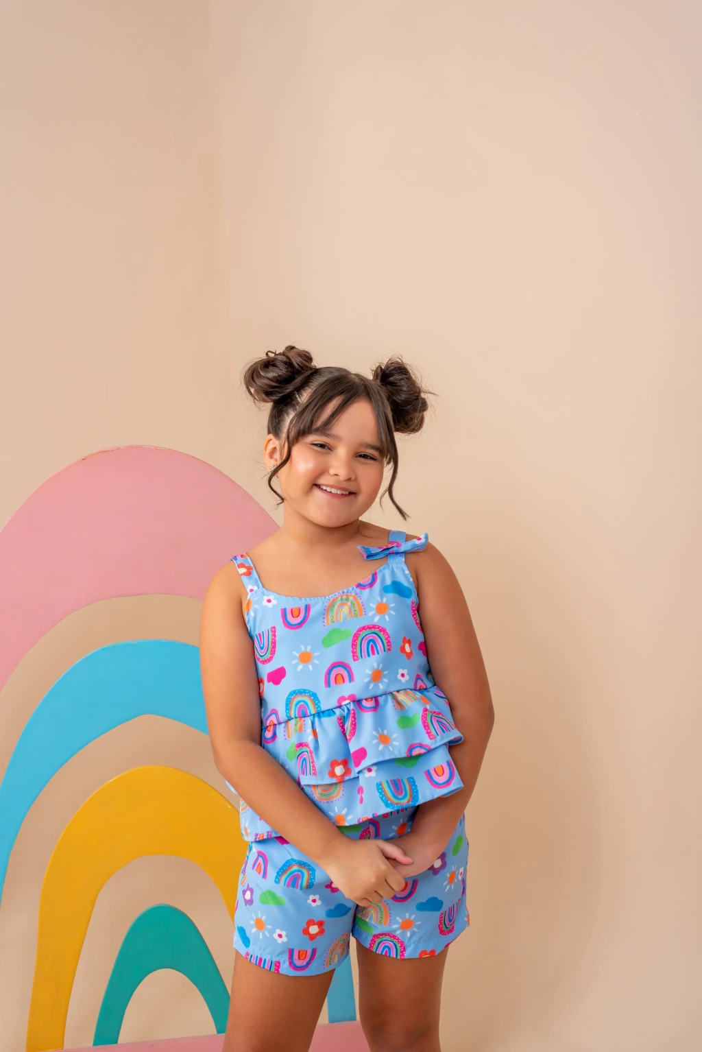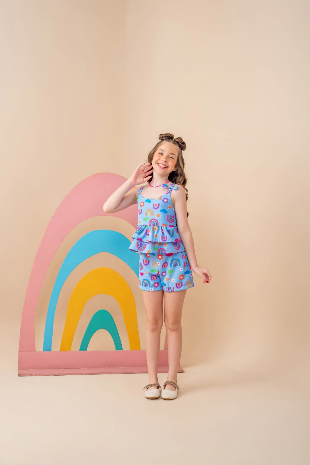 Uma combinação perfeita de estilo e conforto para as pequenas. Confeccionado em tecido crepe microfibra de alta qualidade, este conjunto é leve e ideal para o calor. A blusa destaca-se pelo laçinho no ombrto e babado duplo. O short possui cós reto na frente e elástico nas costas, tambem possui dois bolsos funcionais, unindo praticidade e estilo.