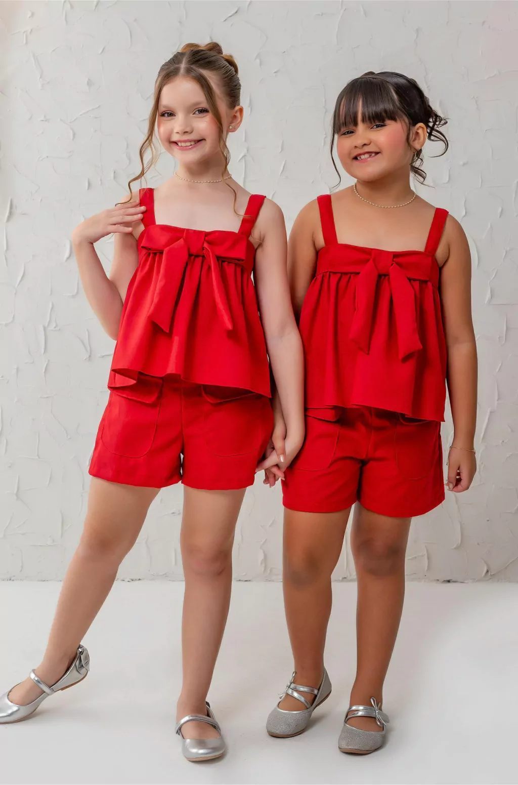 Encante-se com o nosso Conjunto Laço, uma combinação perfeita de estilo e conforto para as pequenas fashionistas. Confeccionado em tecido linho panamá de alta qualidade, composto por 55% algodão, 30% viscose e 15% linho, este conjunto é leve e ideal para o calor. A blusa destaca-se pelo laço na frente e um fechamento com botões nas costas, garantindo um ajuste perfeito e um toque de charme. O short possui dois bolsos funcionais frontais, unindo praticidade e estilo.