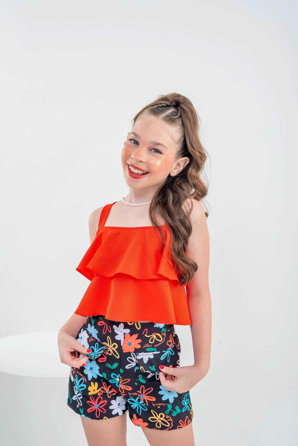 Encante-se com o nosso conjunto, uma combinação perfeita de estilo e conforto para as pequenas. Confeccionado em tecido crepe de alta qualidade, este conjunto é leve e ideal para o calor. A blusa destaca-se pelos babados e laços nas costas, garantindo um ajuste perfeito e um toque de charme. O short possui dois bolsos funcionais frontais, unindo praticidade e estilo.
