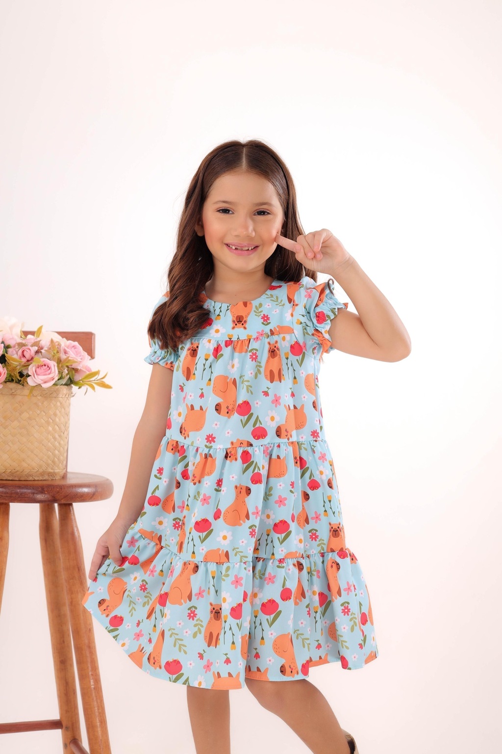 Detalhes: Modelo super rodadinho, com 3 babados na saia, manga bufante, fechamento em botão nas costas.